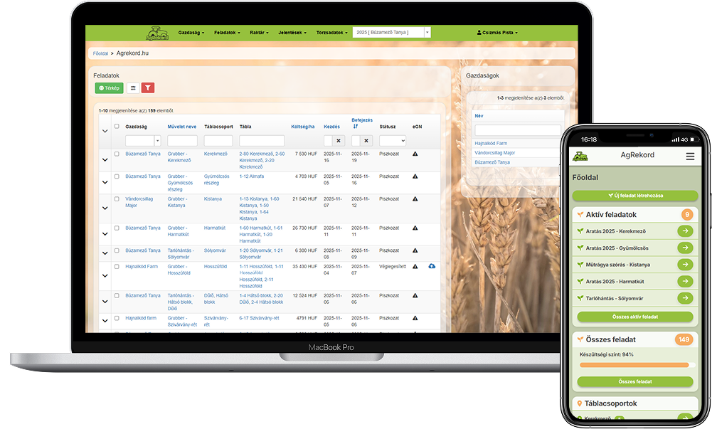 Agrármenedzsment szoftver, amellyel egy helyen látod az ügyfeleid gazdálkodási naplóit, műveleti tábláit, készleteit és kötelező adatszolgáltatásait – valós időben, közös felületen.